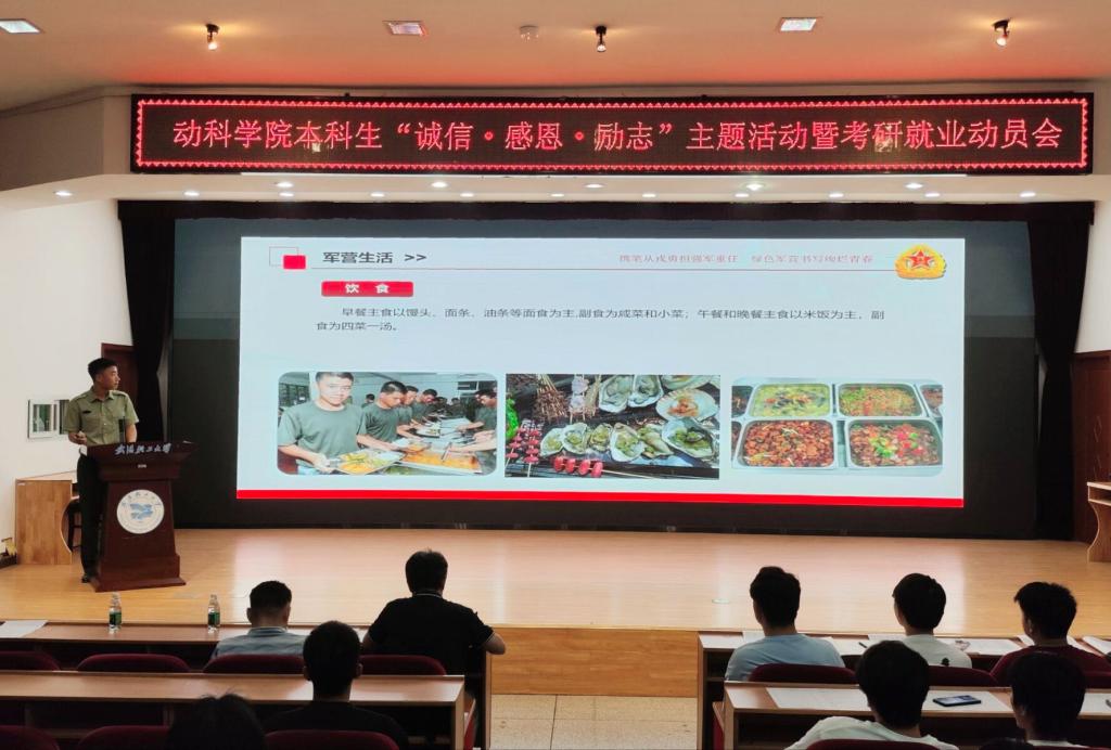 会上,退役大学生士兵、动物科学2102班周远坤同学进行了征兵主题宣讲,号召毕业生到部队建功立业。